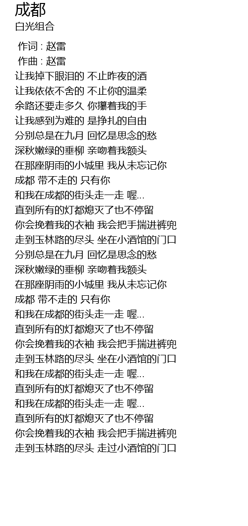 | [01:39.500] | 和我在成都的街头走一走 喔… |