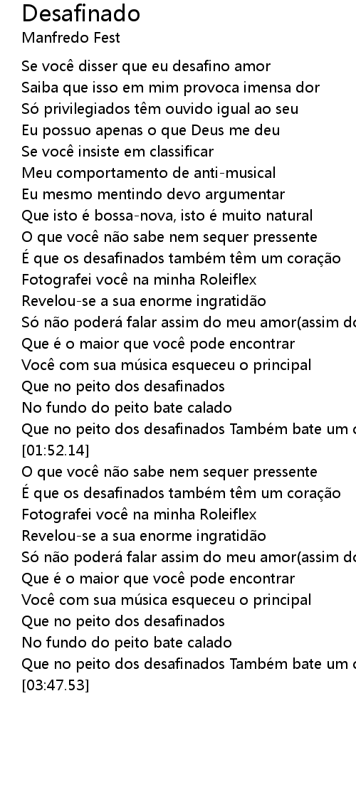 | [03:41.33] | Que no peito dos desafinados Tambe m bate um cora o |