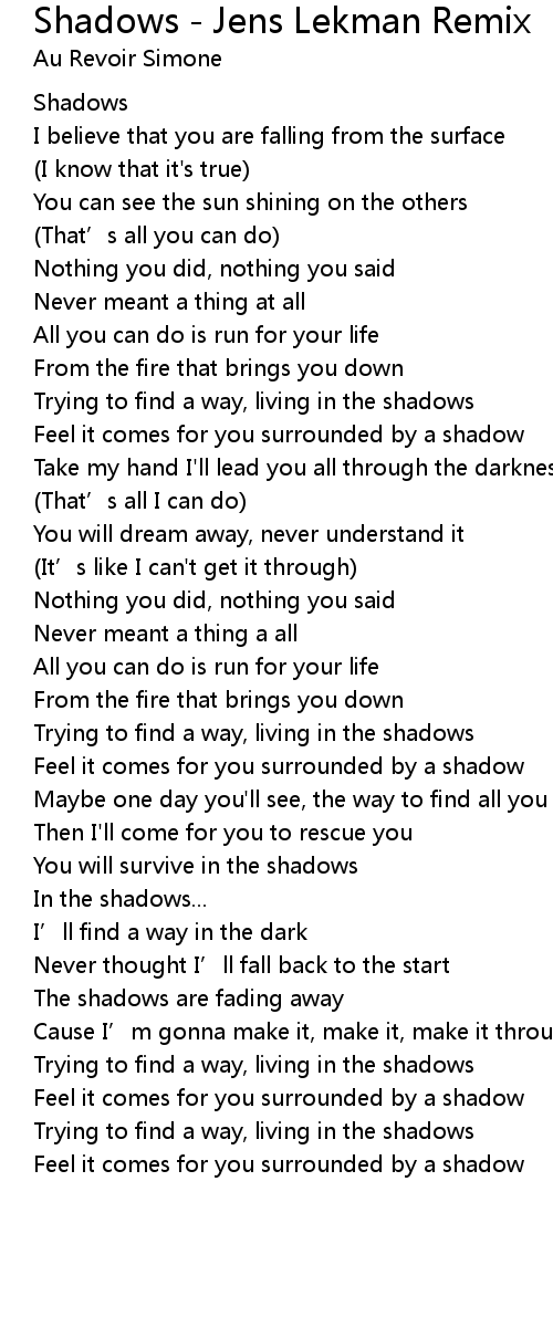 | [03:06.97] | Trying to find a way, living in the shadows |