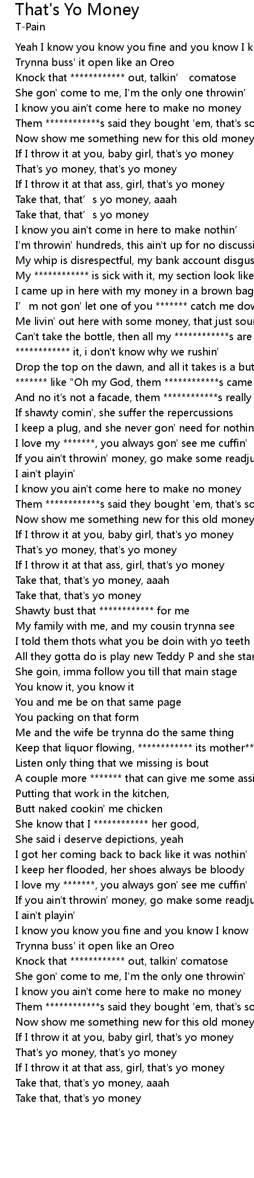 | [01:25.11] | My ************ is sick with it, my section look like a GoFundMe, yeah |