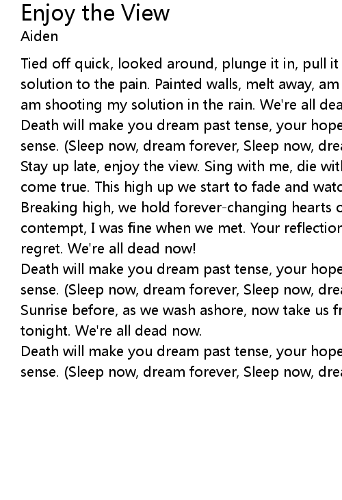 Stay up late, enjoy the view. Sing with me, die with you. Come make my dreams come true. This high up we start to fade and watch the night turn into day. Breaking high, we hold forever-changing hearts of gold. Injection filled with contempt, I was fine when we met. Your reflection hides protected eyes of regret. We're all dead now! |
