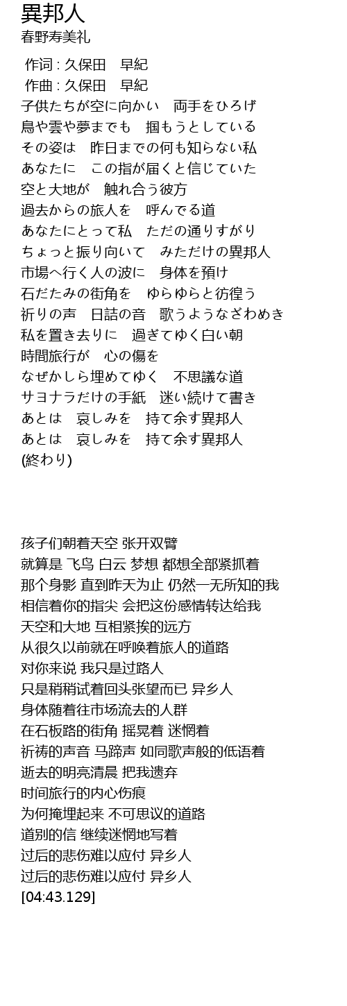 | [03:40.591] | あとは 哀しみを 持て余す異邦人 |