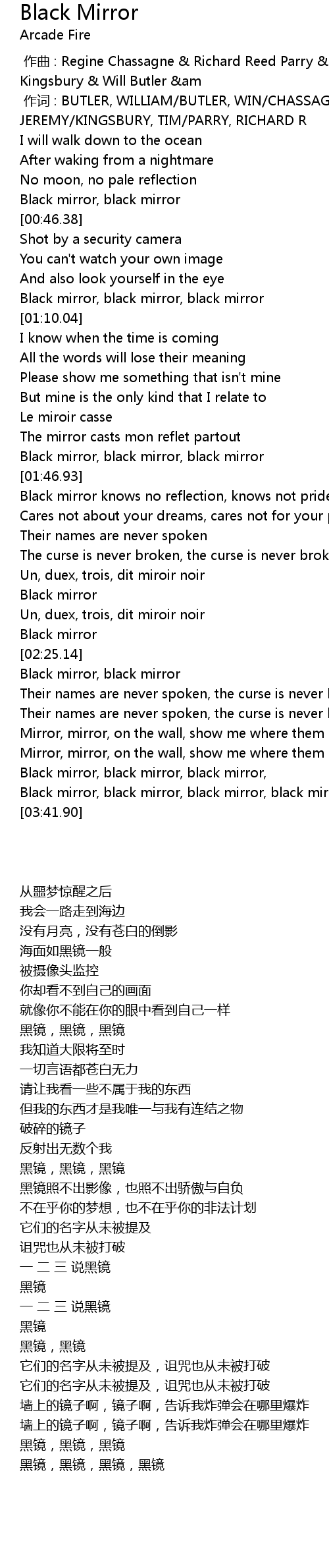 | [01:01.17] | Black mirror, black mirror, black mirror |