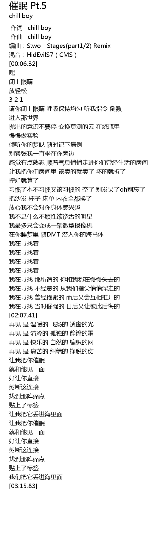 | [00:05.58] | 编曲:Stwo - Stages(part1/2) Remix |