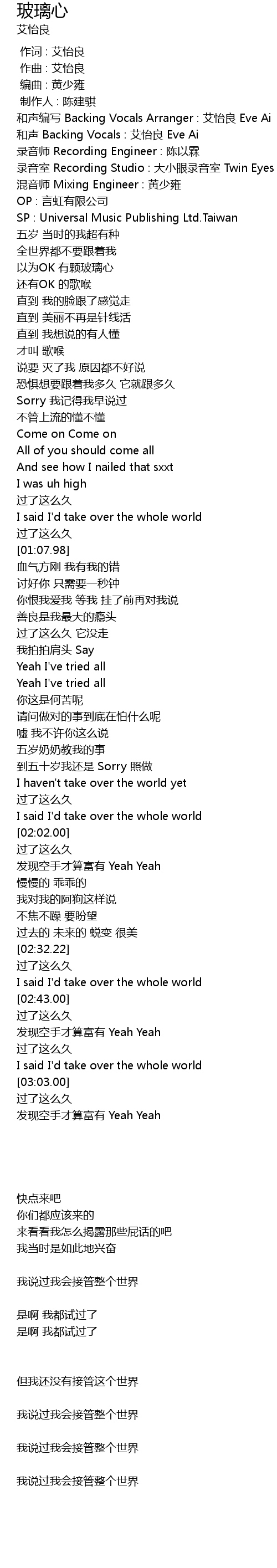 | [03:18.20] | 和声 Backing Vocals : 艾怡良 Eve Ai |