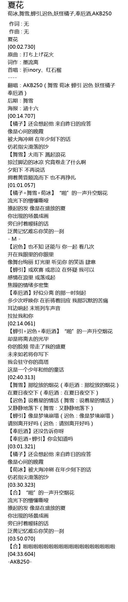 | [00:08.479] | 翻唱:AKB250(舞雪 荀冰 蝉引 迟色 妖怪橘子 奉卮酒) |