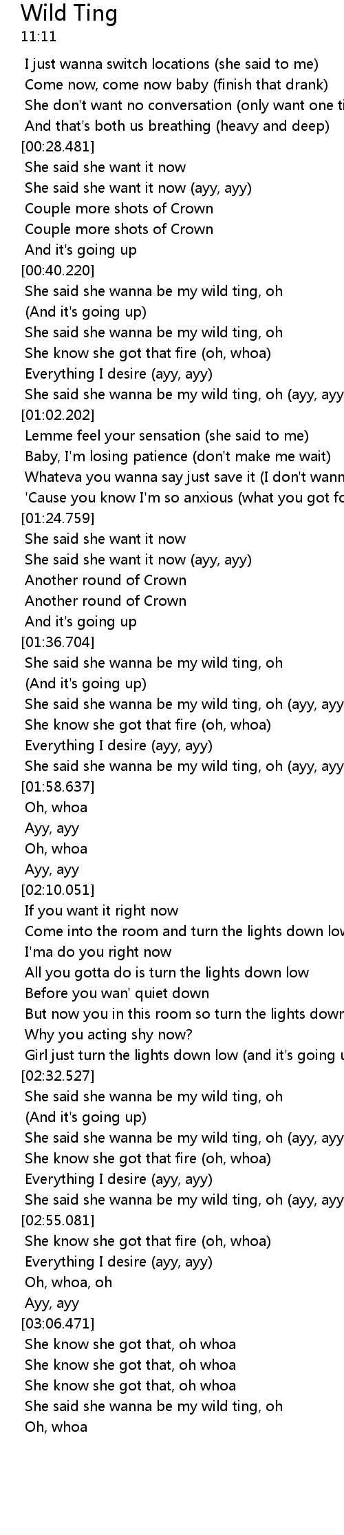 | [01:43.356] | She said she wanna be my wild ting, oh (ayy, ayy) |