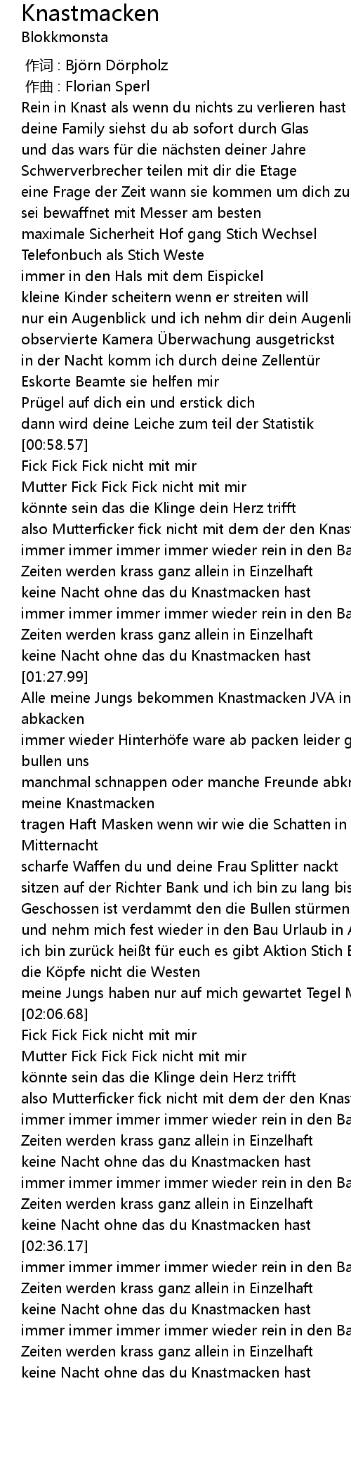 | [02:13.68] | also Mutterficker fick nicht mit dem der den Knast fickt |