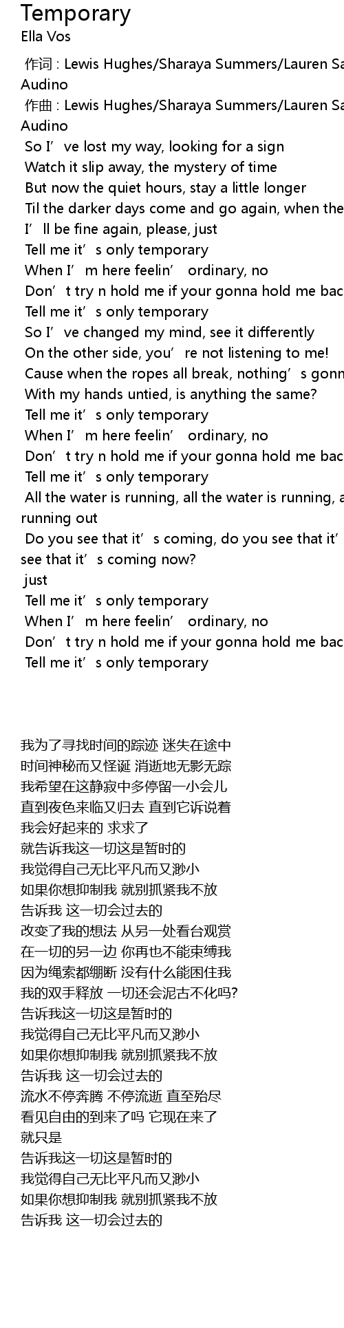 | [00:38.753] | Tell me it' s only temporary |