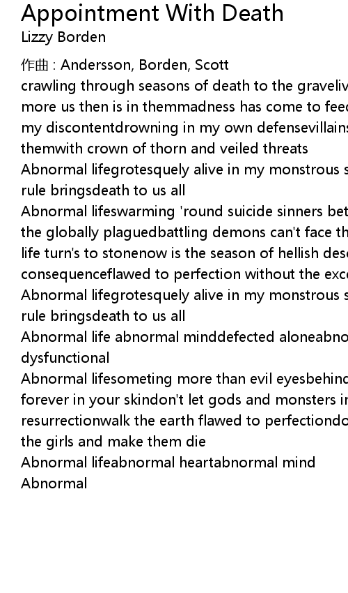 | Abnormal lifeswarming ' round suicide sinners betrayedmalfunctioning death for the globally plaguedbattling demons can' t face them alonesnakes in the mirror life turn' s to stonenow is the season of hellish descentthe lying truth of consequenceflawed to perfection without the exceptioncontaminated degenerated | |