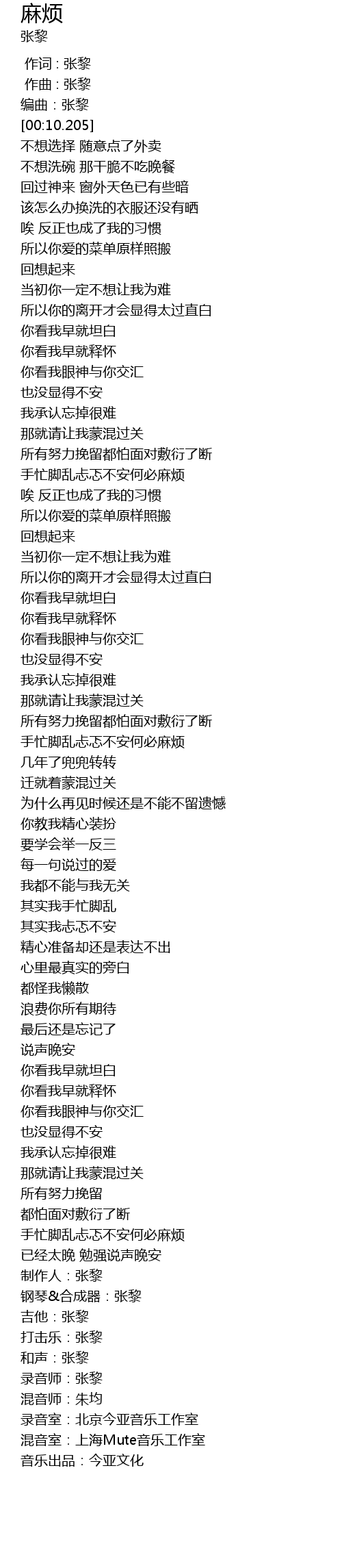 | [02:53.387] | shǒu máng jiǎo luàn tǎn tè bù ān hé bì má fán |