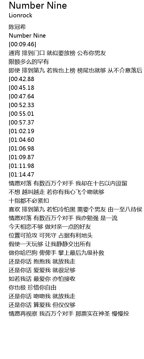 | [01:36.54] | 喜欢 排到第九 若怕冷怕黑 需要个男友 由一至八待侯 |