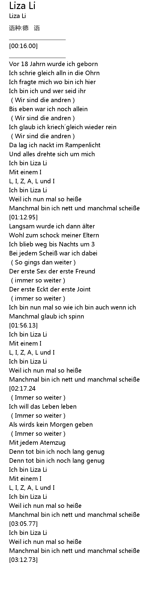 | [03:06.77] | Ich bin Liza Li |