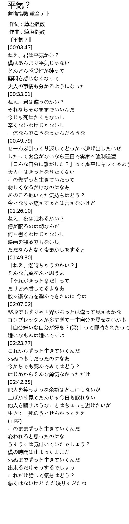 | [00:17.20] | ねえ、君は平気かい? |