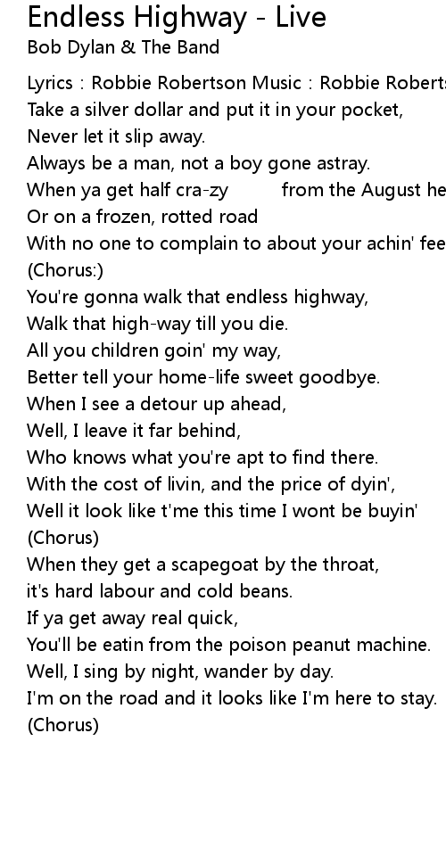 | You' re gonna walk that endless highway, | |