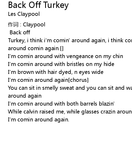 | Turkey, i think i' m comin' around again, i think comin around again, i' m comin around comin again. | |