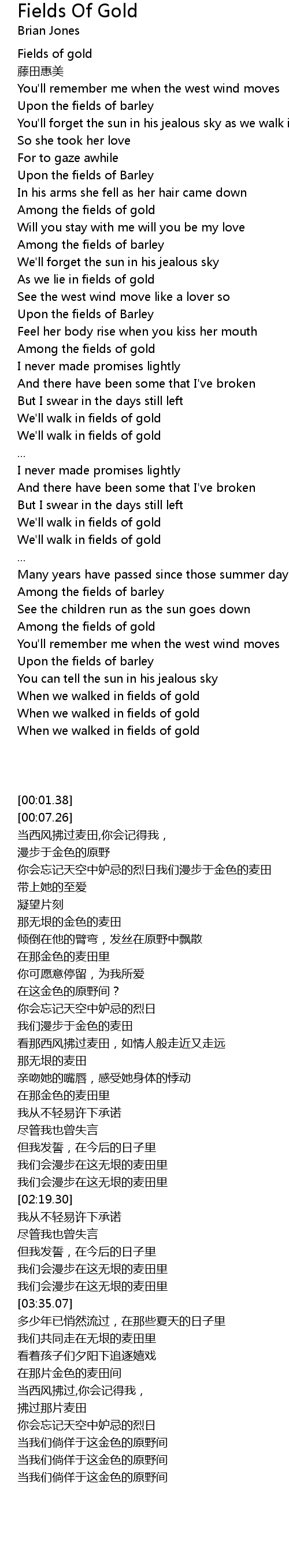 | [00:24.32] | You'll forget the sun in his jealous sky as we walk in fields of gold |