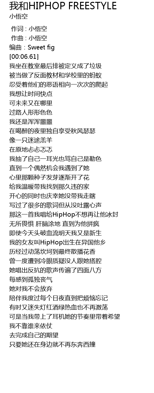 | [00:56.50] | 那这一首我唱给HipHop不想再让他冰封 |
