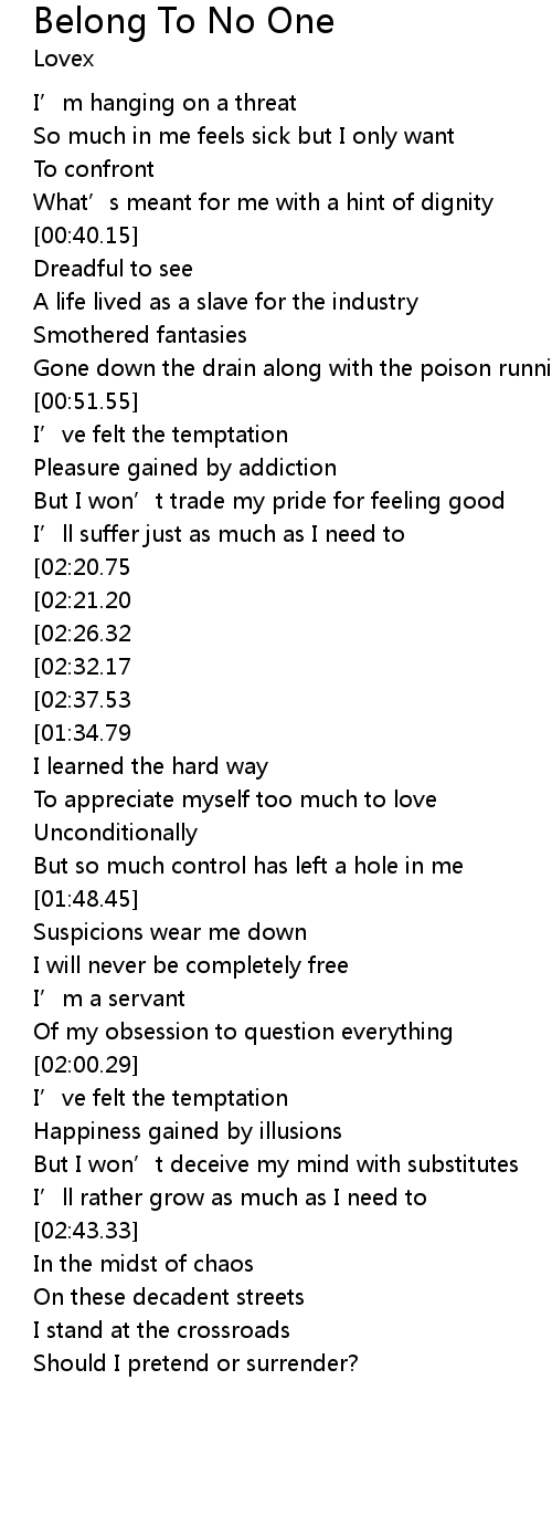 | [03:20.42][02:26.32][01:17.52] | I won' t give in, I belong to no one |