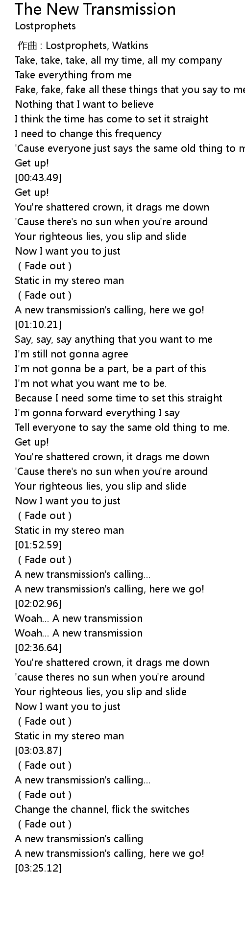 | [01:59.33] | A new transmission' s calling, here we go! |