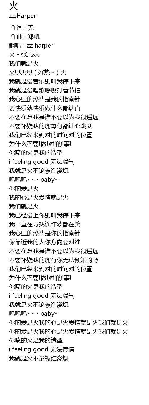 | [02:56.647] | nǐ de ài shì huǒ wǒ de xīn shì huǒ ài qíng jiù shì huǒ wǒ men jiù shì huǒ |