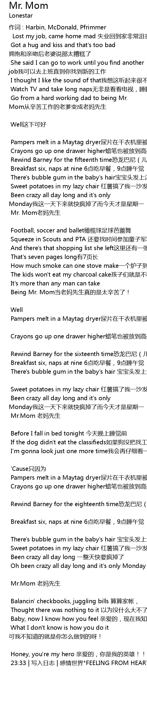 | Go from a hard working dad to being Mr. Mom cong xin ku gong zuo de lao die bian cheng lao ma xian sheng | |