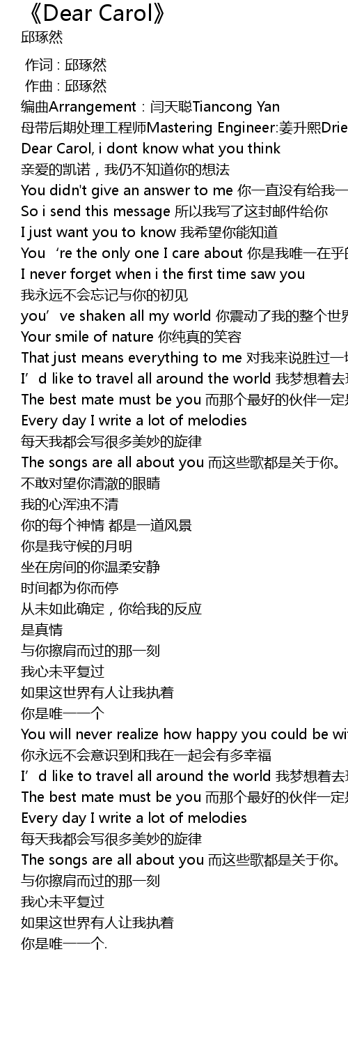 | [00:07.212] | Dear Carol, i dont know what you think qin ai de kai nuo, wo reng bu zhi dao ni de xiang fa |