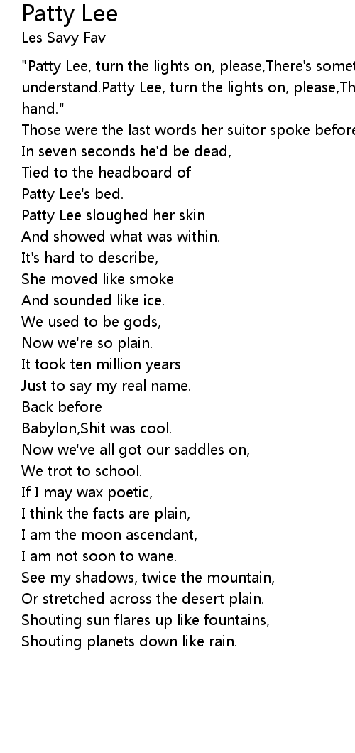 "Patty Lee, turn the lights on, please,There's something I don't understand.Patty Lee, turn the lights on, please,This party's gotten out of hand." |