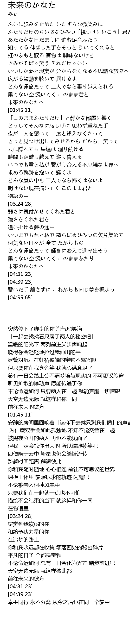 | [02:45.76] | いつでも君と私が 繋がり合える不思議な世界へ |