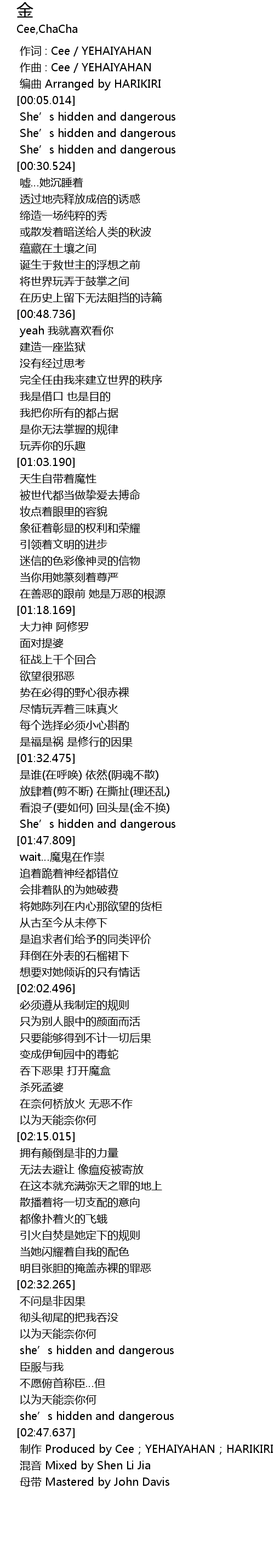 | [02:49.063] | 制作 Produced by Cee;YEHAIYAHAN;HARIKIRI |
