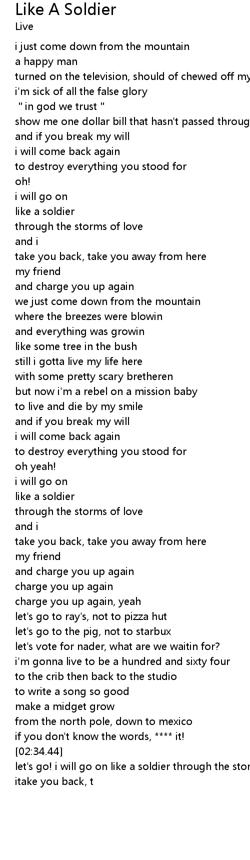 | [02:35.01] | let' s go! i will go on like a soldier through the storms of love and itake you back, t |
