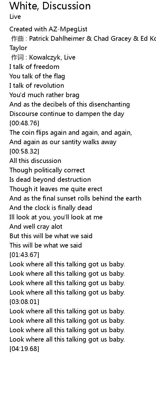 | [00:00.00] | 作曲 : Patrick Dahlheimer & Chad Gracey & Ed Kowalczyk & Chad Taylor |