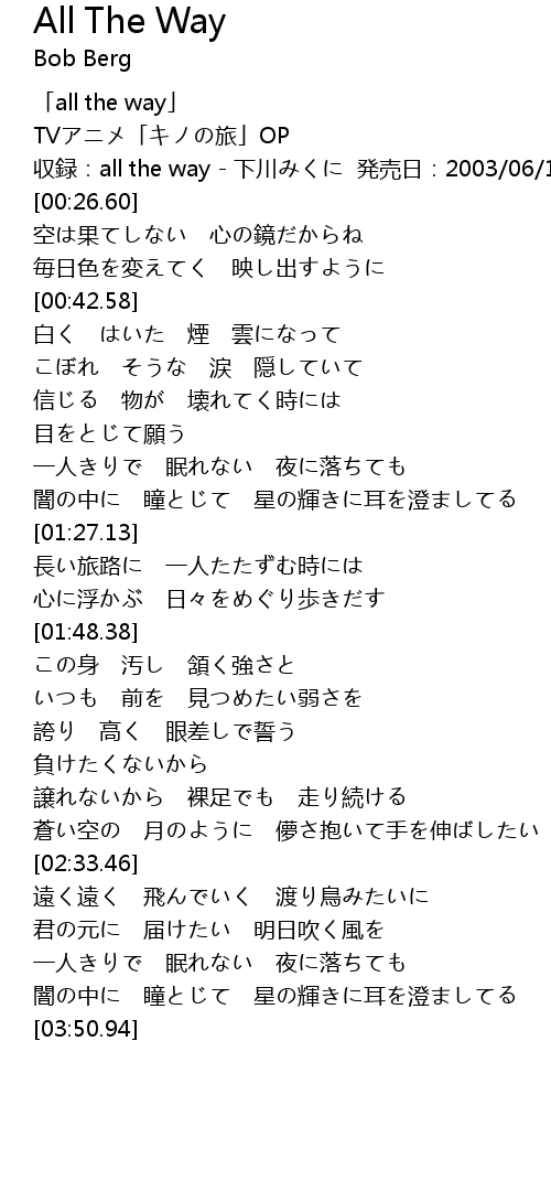 | [00:09.00] | 収録:all the way - 下川みくに 発売日:2003/06/18 |