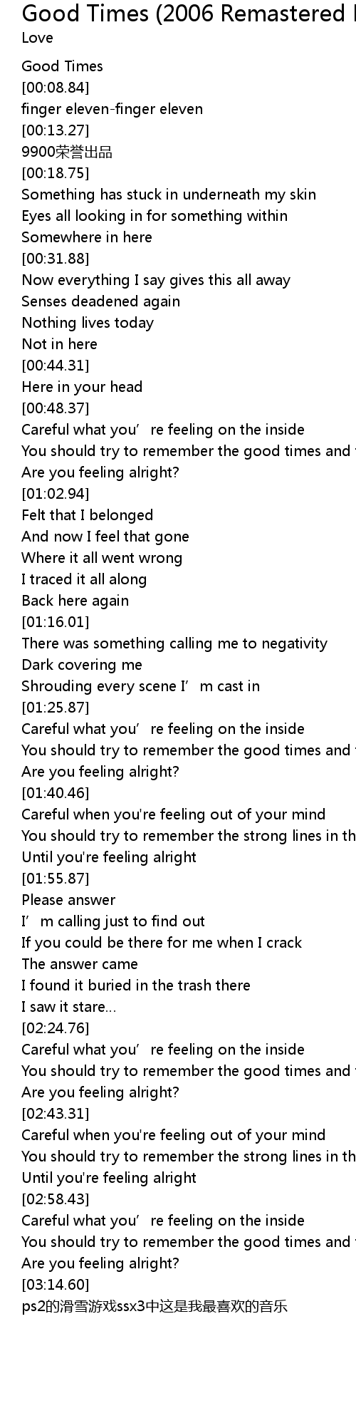 | [03:08.83] | Are you feeling alright? |