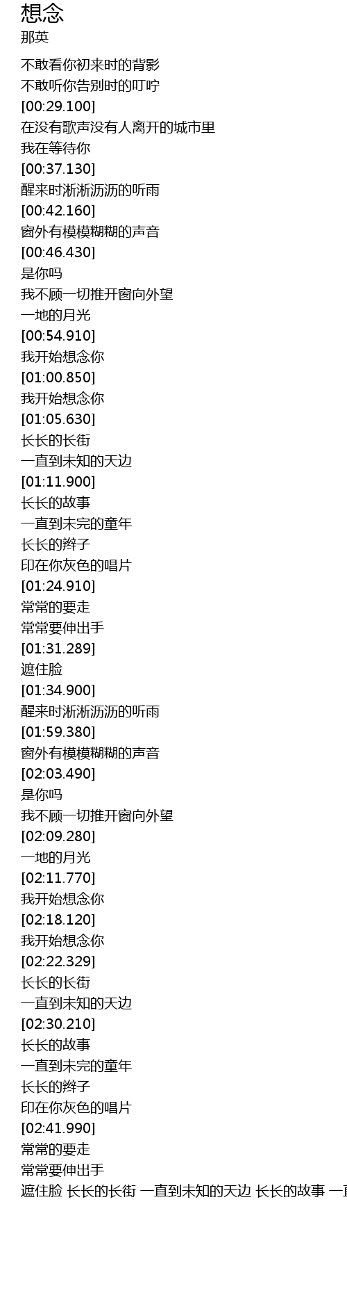 | [02:47.470] | 遮住脸 长长的长街 一直到未知的天边 长长的故事 一直到未完的童年 长长的辫子 印在你灰色的唱片 常常的要走 常常要伸出手 遮住脸 |
