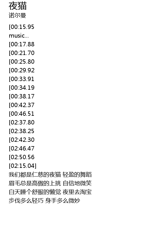 | [01:23.85][00:17.88] | 我们都是夜猫 轻盈的舞蹈 |