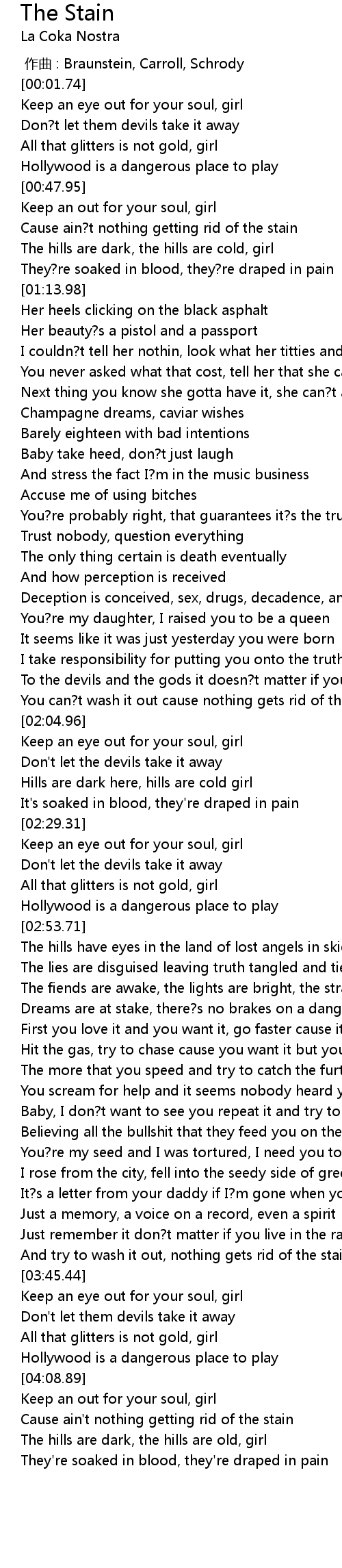 | [03:41.82] | And try to wash it out, nothing gets rid of the stain |