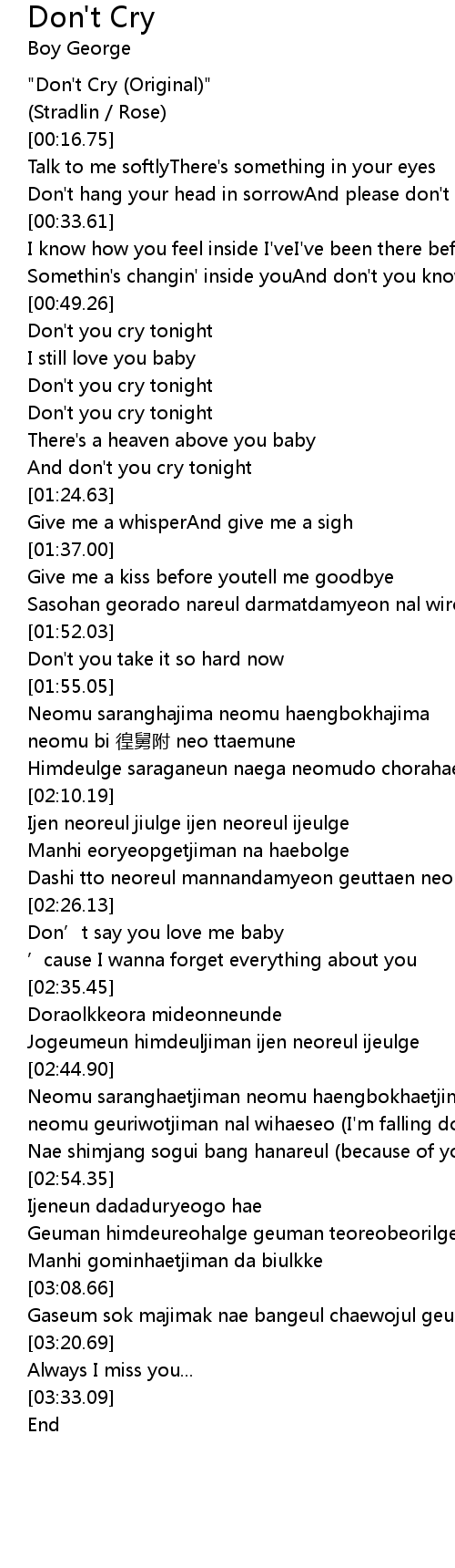 | [00:24.85] | Don' t hang your head in sorrowAnd please don' t cry |