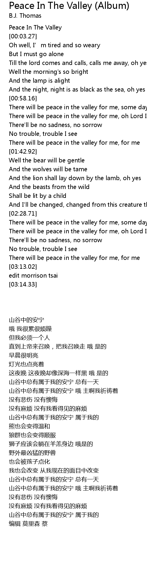 | [03:04.22] | There will be peace in the valley for me, for me |