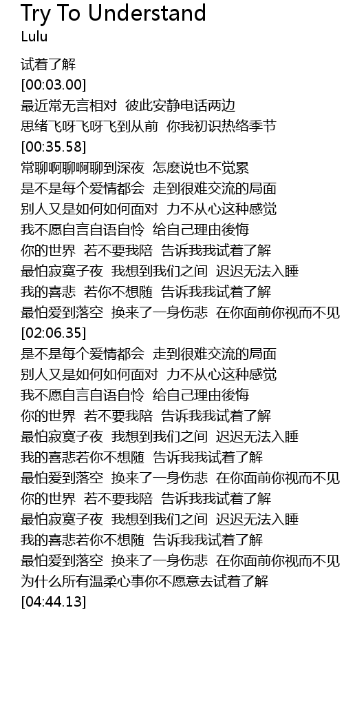 | [04:02.00] | 我的喜悲若你不想随 告诉我我试着了解 |
