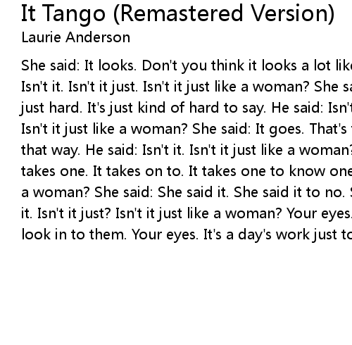She said: It looks. Don't you think it looks a lot like rain? He said: Isn't it. Isn't it just. Isn't it just like a woman? She said: It's hard. It's just hard. It's just kind of hard to say. He said: Isn't it. Isn't it just. Isn't it just like a woman? She said: It goes. That's the way it goes. It goes that way. He said: Isn't it. Isn't it just like a woman? She said: It takes. It takes one. It takes on to. It takes one to know one. He said: Isn't it just like a woman? She said: She said it. She said it to no. She said it to no one. Isn't it. Isn't it just? Isn't it just like a woman? Your eyes. It's a day's work to look in to them. Your eyes. It's a day's work just to look in to them. |