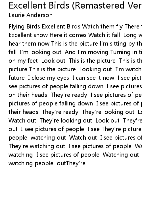Flying Birds Excellent Birds Watch them fly There they go Falling snow Excellent snow Here it comes Watch it fall Long words Excellent words UI can hear them now This is the picture I'm sitting by the window Watching the snow fall I'm looking out And I'm moving Turning in time Jump up And I can land on my feet Look out This is the picture This is the picture This is the picture This is the picture Looking out I'm watching now But when I see the future I close my eyes I can see it now I see pictures of people rising up I see pictures of people falling down I see pictures of people they're standing on their heads They're ready I see pictures of people rising up I see pictures of people falling down I see pictures of people they're standing on their heads They're ready They're looking out Look out They're watching out Watch out They're looking out Look out They're watching out Watching watching out I see pictures of people I see They're pictures watching of They're people watching out Watch out I see pictures of people They're watching They're watching out I see pictures of people Watching Watch out They're watching I see pictures of people Watching out Watch out Pictures of watching people outThey're |