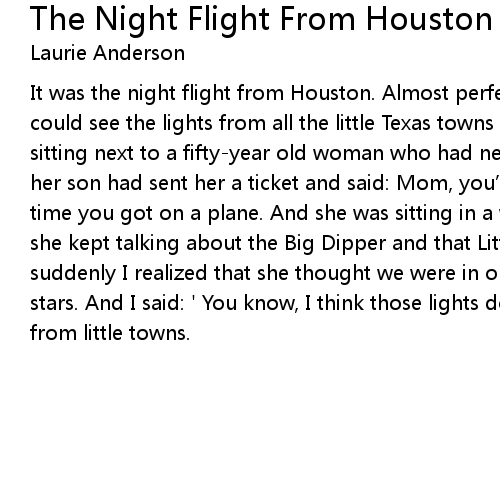 | [00:09.02] | It was the night flight from Houston. Almost perfect visibility. You could see the lights from all the little Texas towns far below. And I was sitting next to a fifty-year old woman who had never been on a plane before. And her son had sent her a ticket and said: Mom, you’ve raised ten kids; it’s time you got on a plane. And she was sitting in a window seat staring out and she kept talking about the Big Dipper and that Little Dipper and pointing; and suddenly I realized that she thought we were in outer space looking down at the stars. And I said: ' You know, I think those lights down there are the lights from little towns. |
