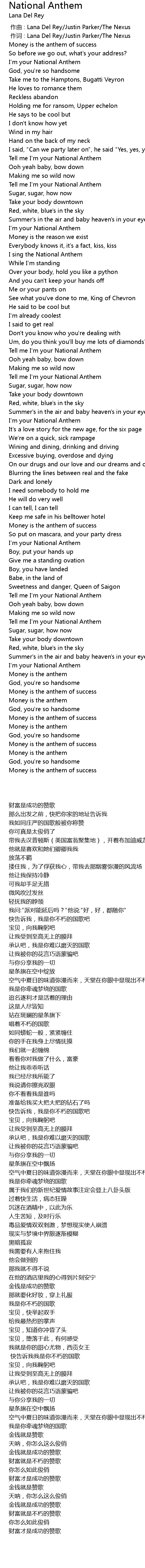 | [00:01.00] | 作词 : Lana Del Rey/Justin Parker/The Nexus |