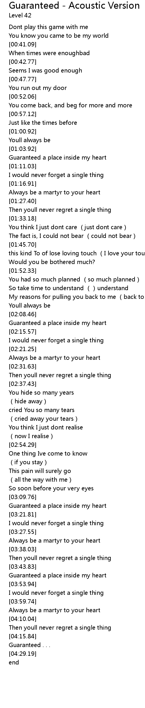 | [02:09.58] | Guaranteed a place inside my heart |