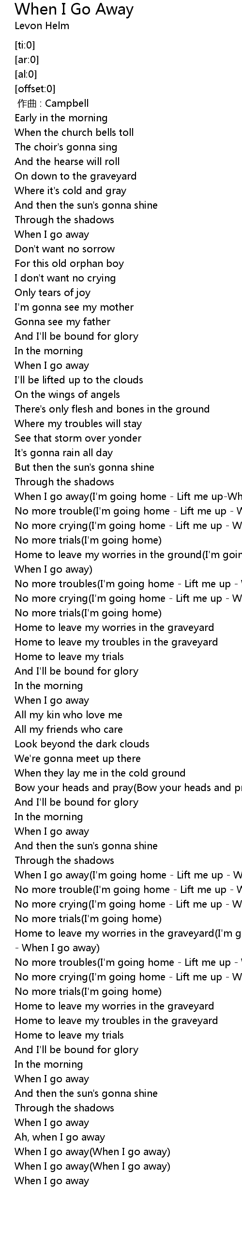 | [03:14.36] | When I go away I' m going home Lift me up When I go away |
