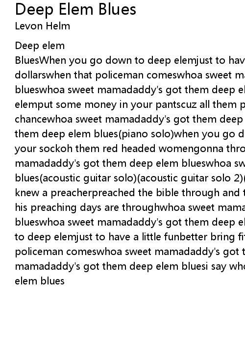 BluesWhen you go down to deep elemjust to have a little funbetter bring fifty dollarswhen that policeman comeswhoa sweet mamadaddy's got them deep elem blueswhoa sweet mamadaddy's got them deep elem blueswhen you go down to deep elemput some money in your pantscuz all them pretty womennever give a man a chancewhoa sweet mamadaddy's got them deep elem blueswhoa sweet mamadaddy's got them deep elem blues(piano solo)when you go down to deep elemput some money in your sockoh them red headed womengonna throw you on the rockswhoa sweet mamadaddy's got them deep elem blueswhoa sweet mamadaddy's got them deep elem blues(acoustic guitar solo)(acoustic guitar solo 2)(mandolin solo)well i once knew a preacherpreached the bible through and throughwent down to deep elemnow his preaching days are throughwhoa sweet mamadaddy's got them deep elem blueswhoa sweet mamadaddy's got them deep elem blues(horn solo)when you go down to deep elemjust to have a little funbetter bring fifty dollarswhen that policeman comeswhoa sweet mamadaddy's got them deep elem blueswhoa sweet mamadaddy's got them deep elem bluesi say whoa sweet mamadaddy's got htem deep elem blues |
