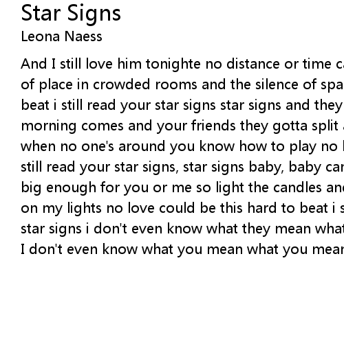 And I still love him tonighte no distance or time can bite and i still feel out of place in crowded rooms and the silence of space no love could be this hard to beat i still read your star signs star signs and they know just when to hit when morning comes and your friends they gotta split and you know just what to say when no one's around you know how to play no love could be this hard to beat i still read your star signs, star signs baby, baby can't you see this world ain't big enough for you or me so light the candles and turn out your lights and turn on my lights no love could be this hard to beat i still read your star signs, star signs i don't even know what they mean what you mean |