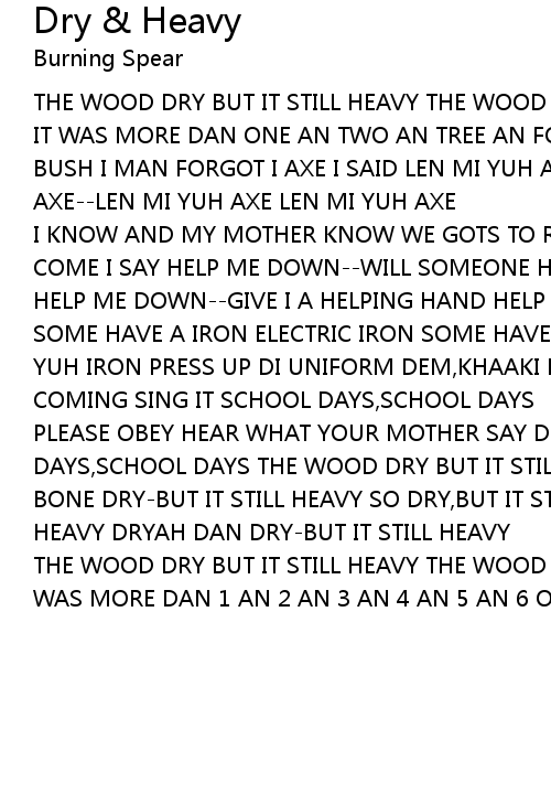 PLEASE OBEY HEAR WHAT YOUR MOTHER SAY DIS IS -DIS IS- DIS IS- DIS IS SCHOOL DAYS,SCHOOL DAYS THE WOOD DRY BUT IT STILL HEAVY THE WOOD DRY BUT IT STILL HEAVY BONE DRY-BUT IT STILL HEAVY SO DRY,BUT IT STILL HEAVY WELL DRY-BUT IT STILL HEAVY DRYAH DAN DRY-BUT IT STILL HEAVY |