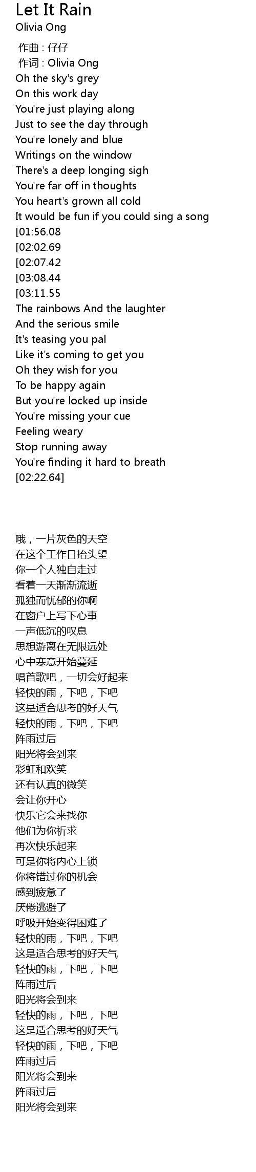 | [02:50.64][01:56.08][00:56.90] | Let it rain rain |